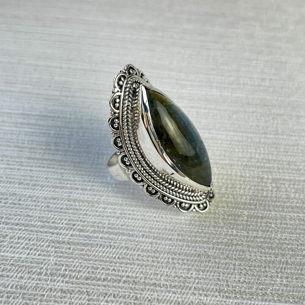 Este anel é a escolha perfeita para quem busca um toque sofisticado em seu visual. Com um design exclusivo que combina a beleza da labradorita e a pureza da prata 925, esta peça é verdadeiramente única.