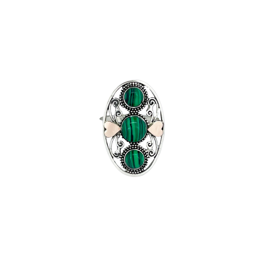 Descubra a sofisticação do Anel Prata 925 Oval com Malaquitas Naturais e Filetes de Ouro 10K em Corações, uma joia que une elegância e a beleza singular das pedras naturais.